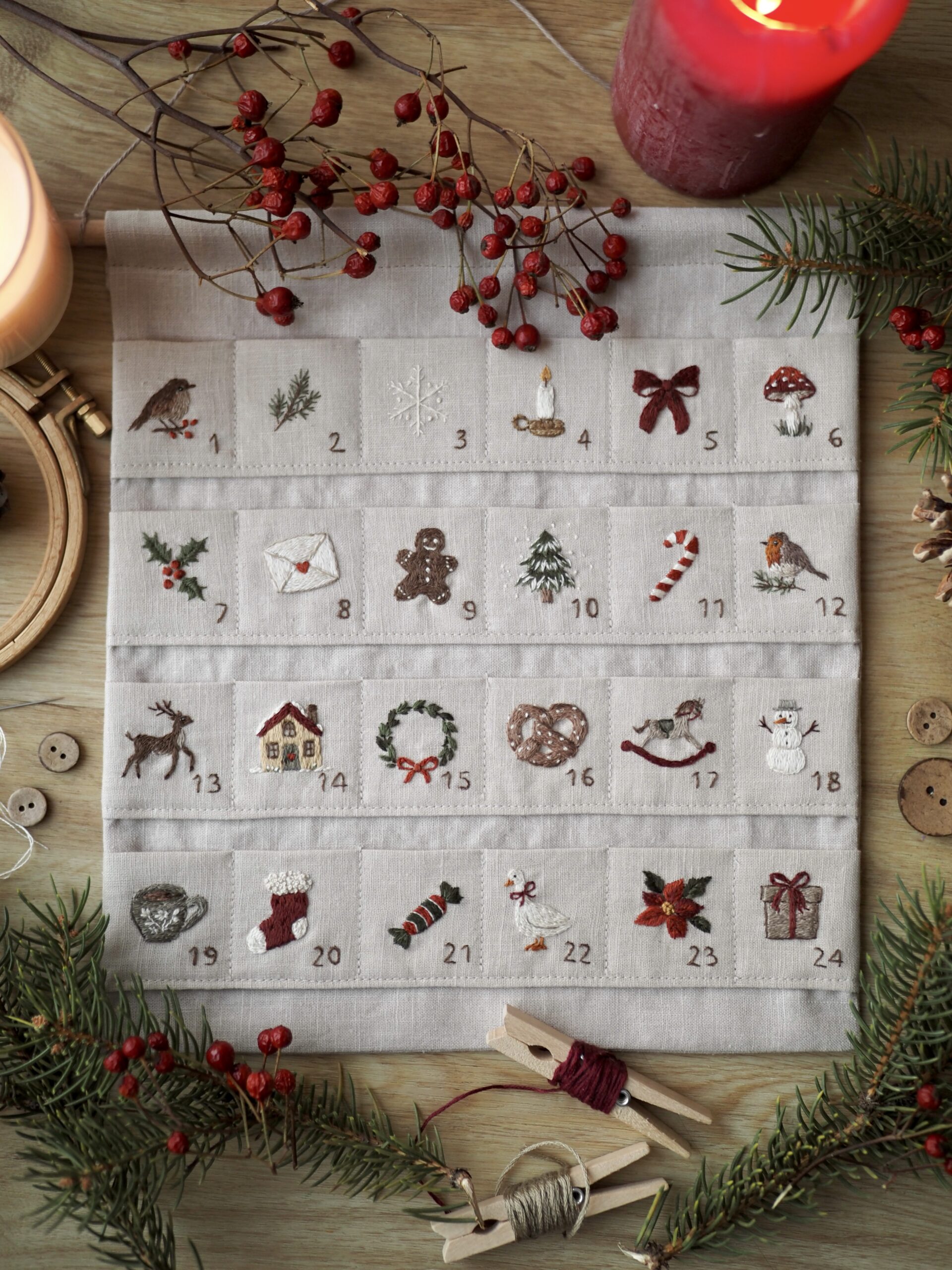 Mit dem Vintage Adventskalender Stick- & Nähmuster zieht Wärme und nostalgischer Zauber in dein Zuhause ein. Das digitale Schnitt- und Stickmuster enthält 24 handgezeichnete Mini-Weihnachtsmotive im Cottage-Stil sowie eine ausführliche Nähanleitung für deinen eigenen Adventskalender.